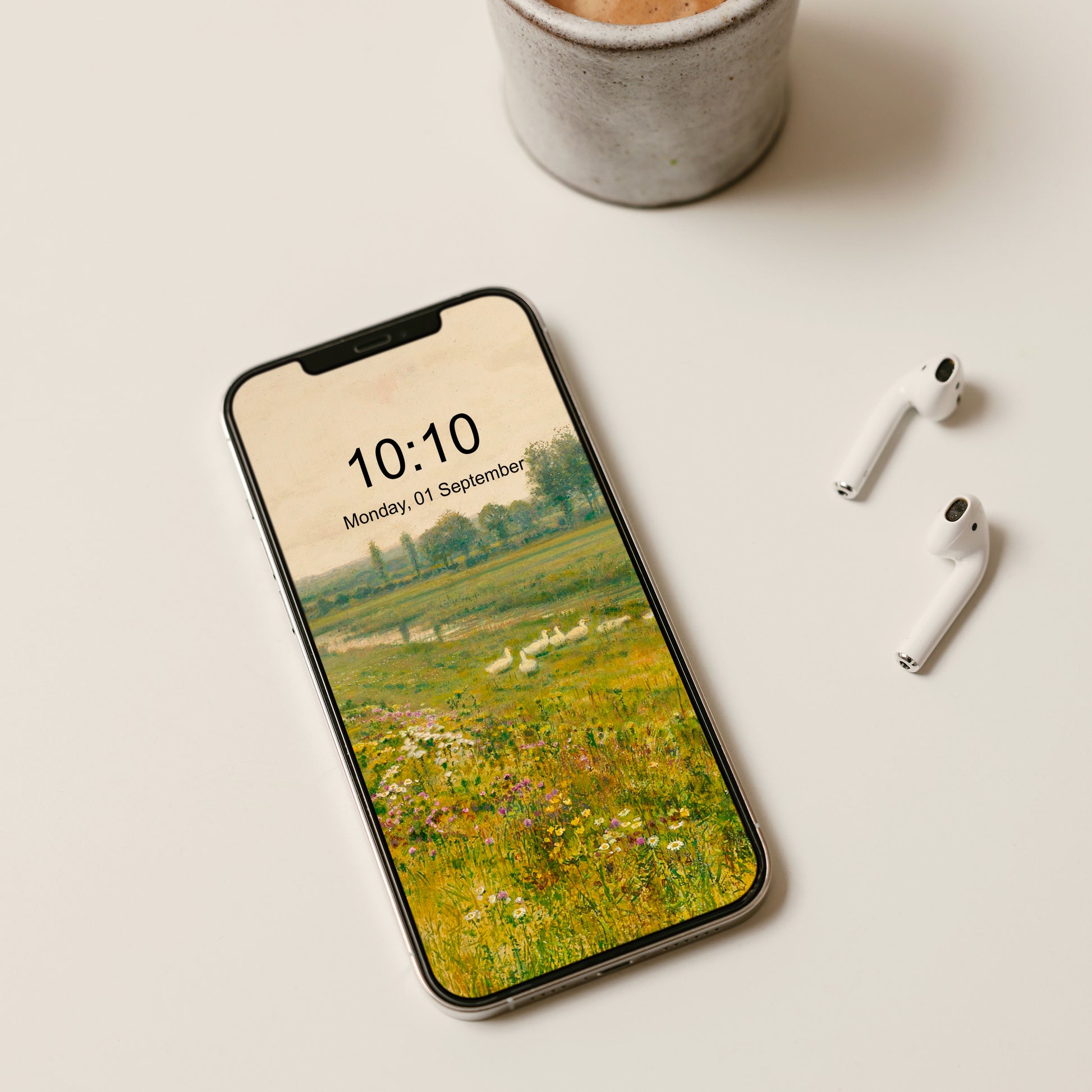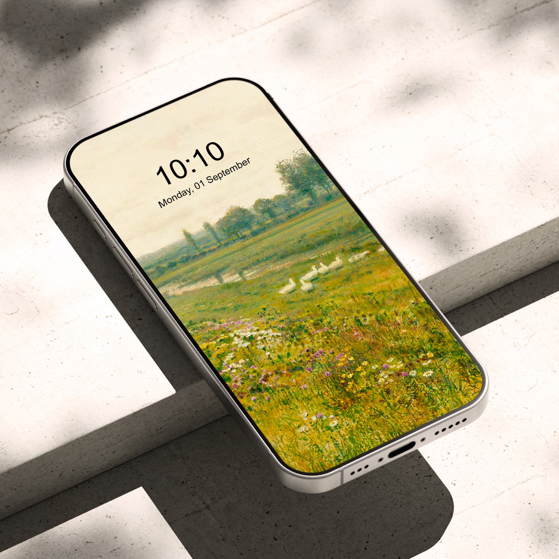 Lleva la belleza tranquila de la naturaleza a la pantalla de tu móvil con este fondo de pantalla digital artístico, basado en la obra “An Extensive Meadow Landscape with Geese by a Stream” del pintor inglés John Atkinson Grimshaw.