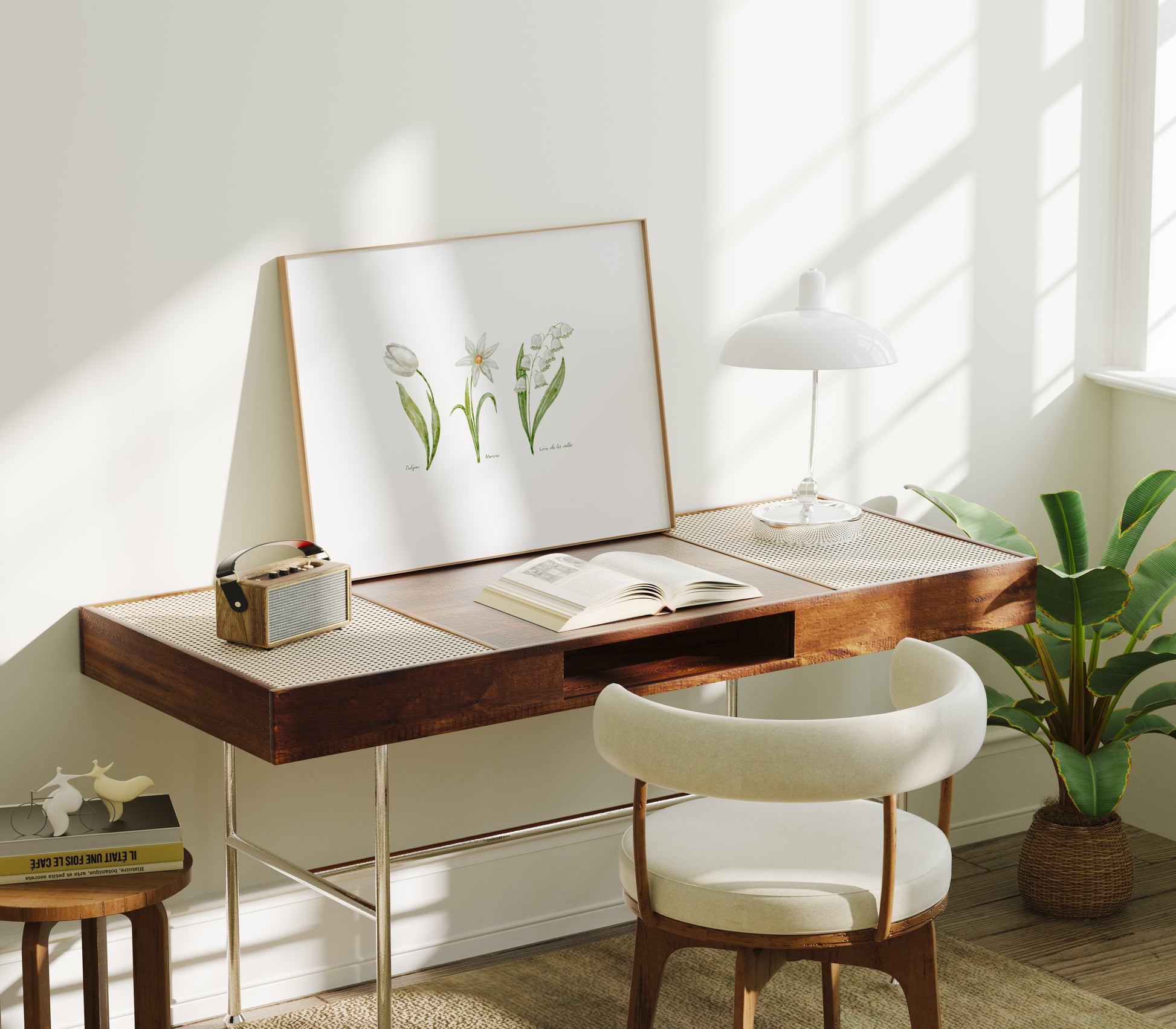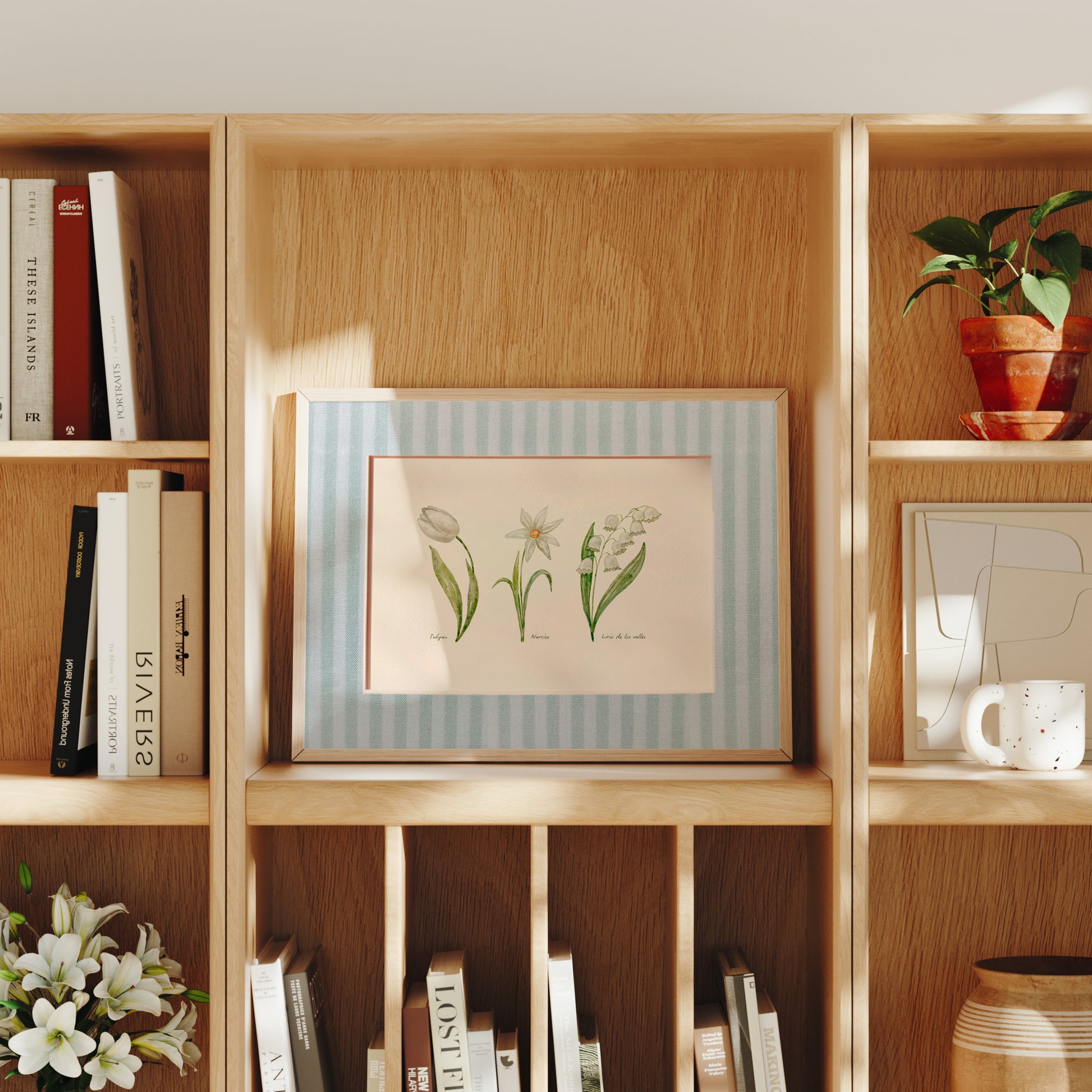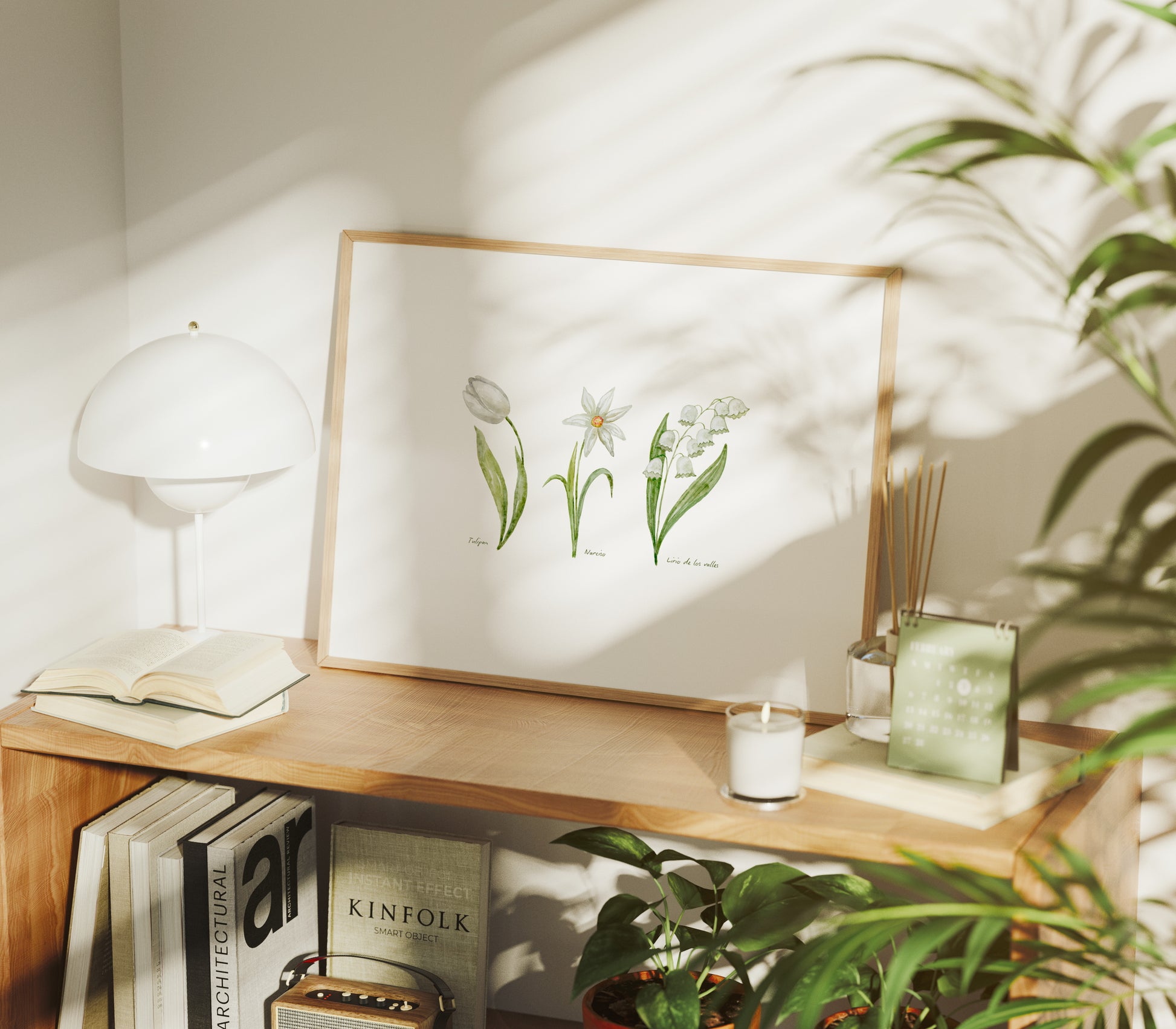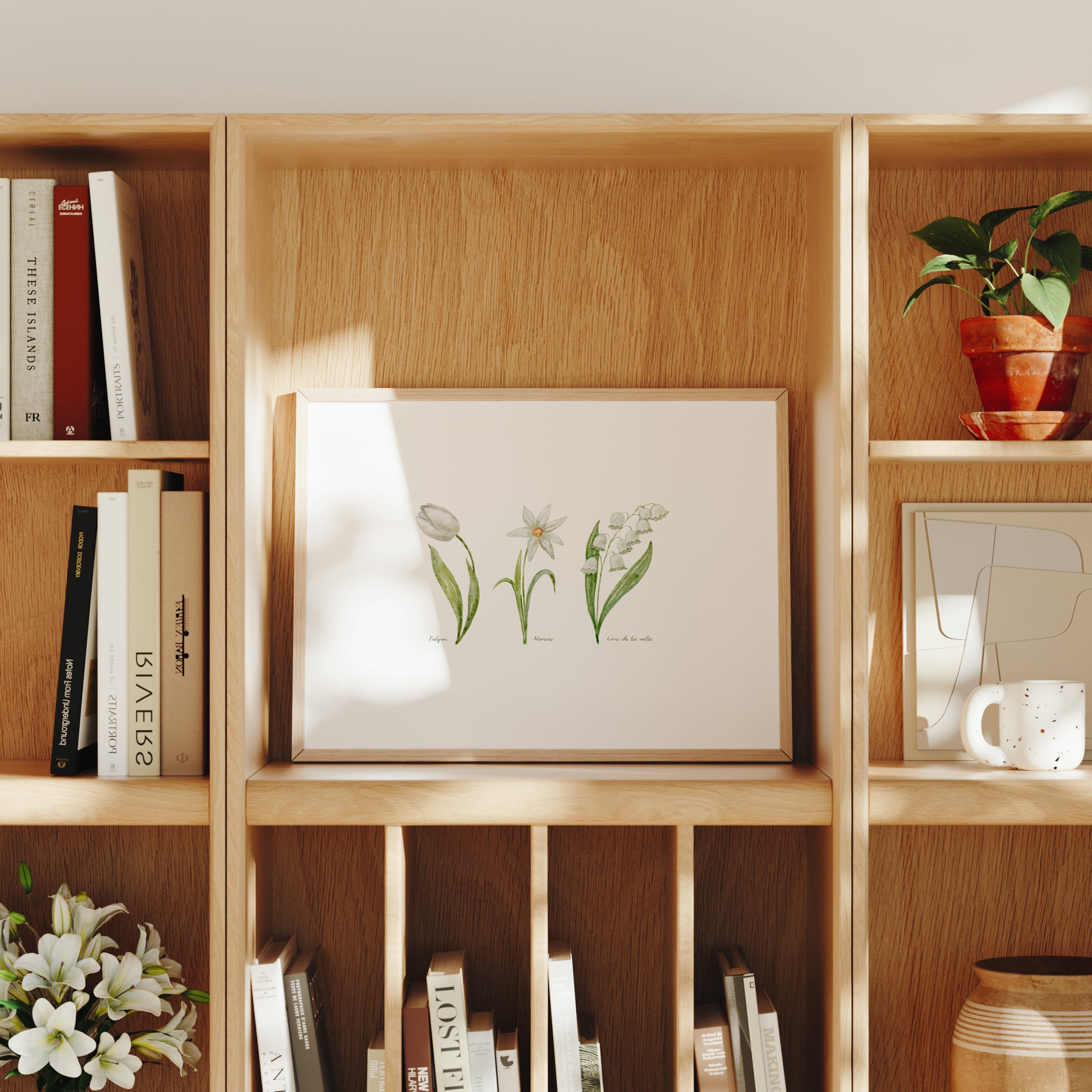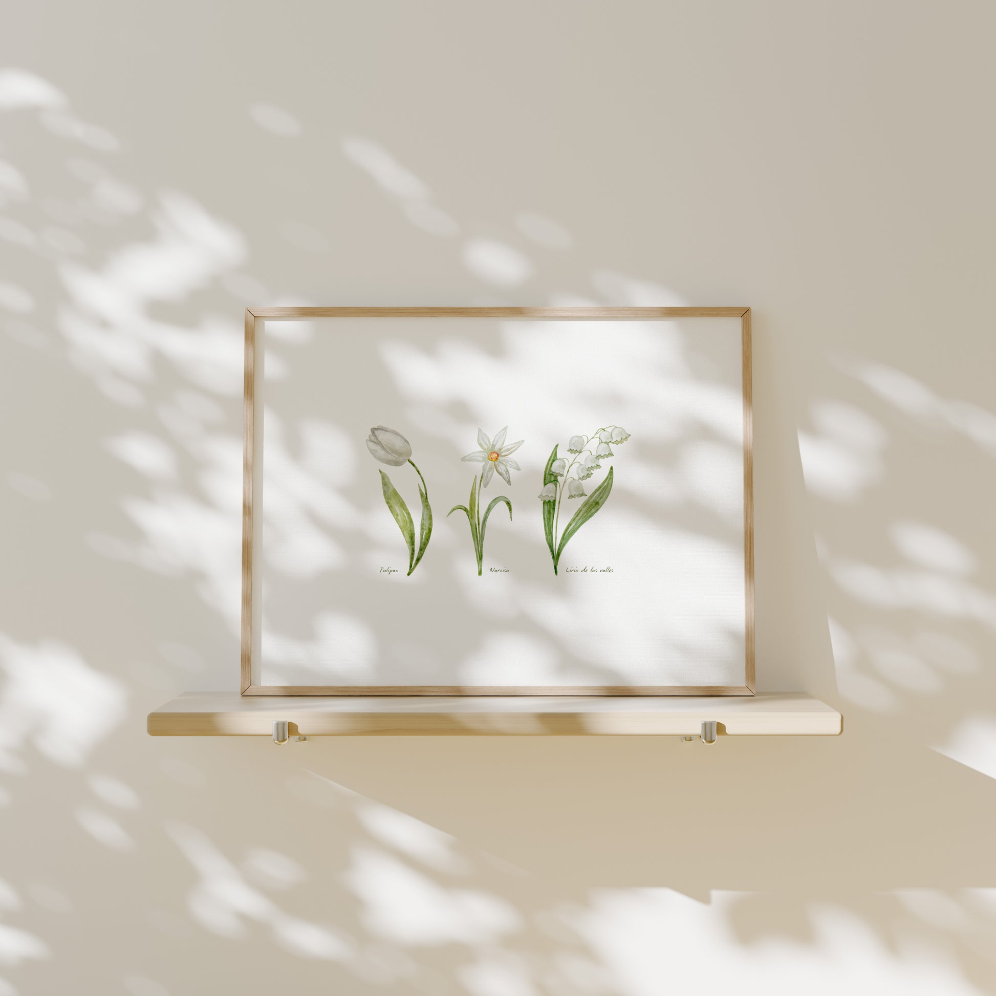 Aporta delicadeza y elegancia a tus espacios con esta ilustración botánica en acuarela, que reúne tres flores emblemáticas: el tulipán, símbolo de amor y belleza; el narciso, que representa la esperanza y la renovación; y el lirio de los valles, asociado a la pureza y la ternura.