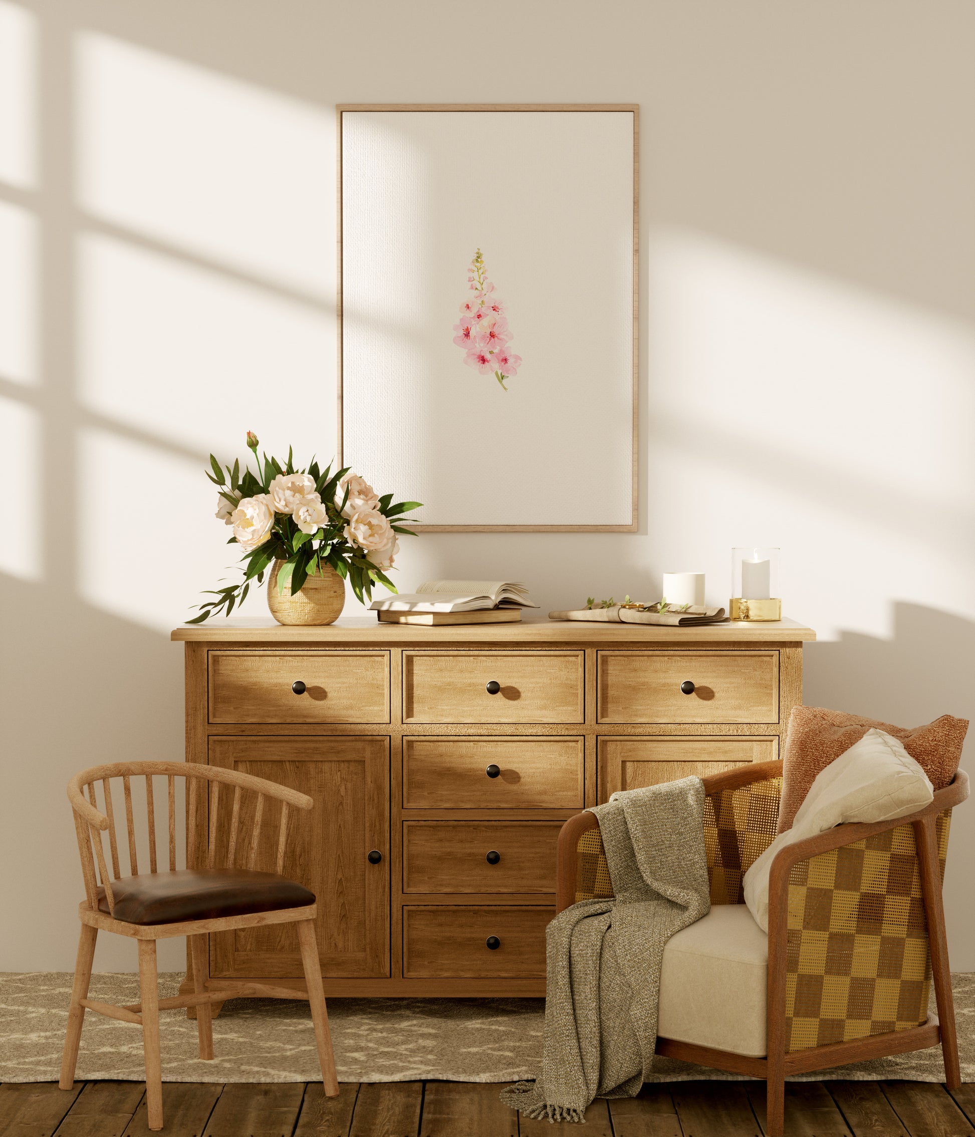 Añade un toque de romanticismo y frescura a tu hogar con esta ilustración en acuarela, una pieza artística que combina delicadeza, color y elegancia. Sus suaves tonos en rosa y verde transmiten calma y armonía, lo que la convierte en una lámina perfecta para realzar la decoración de interiores con un estilo natural y sofisticado.