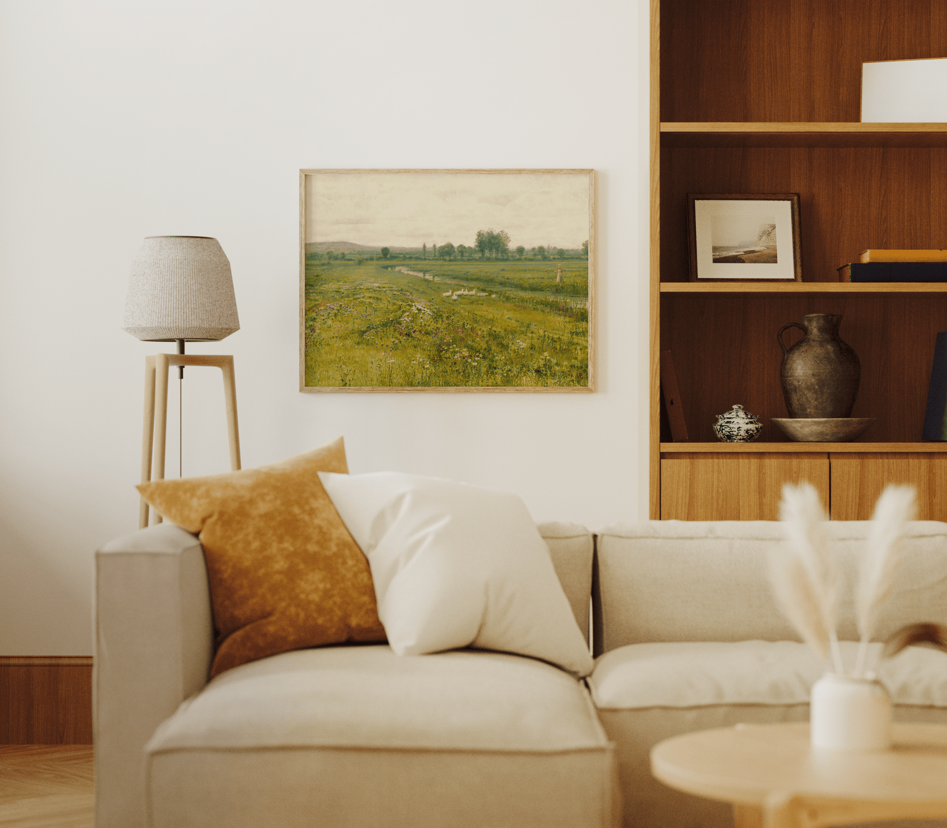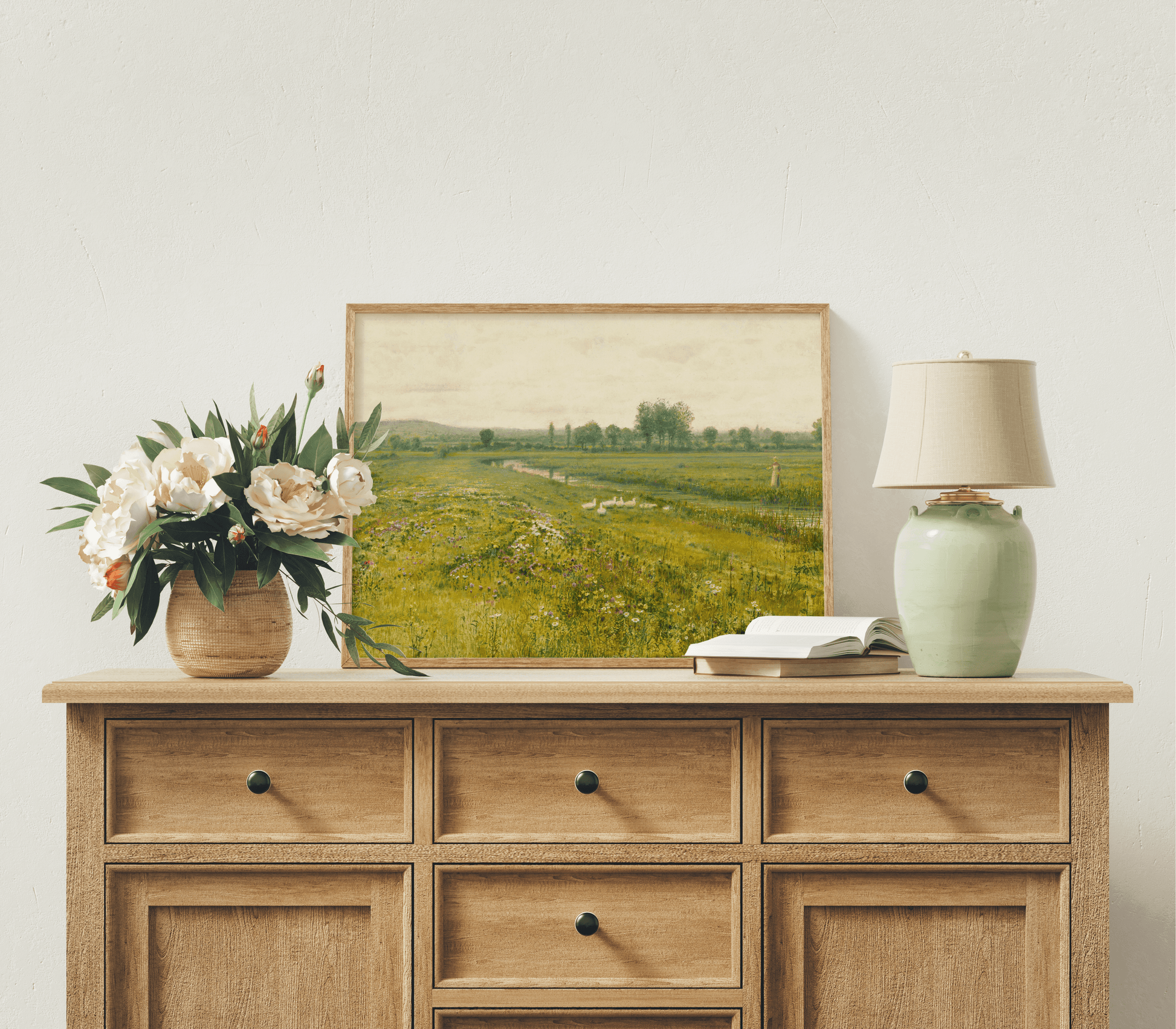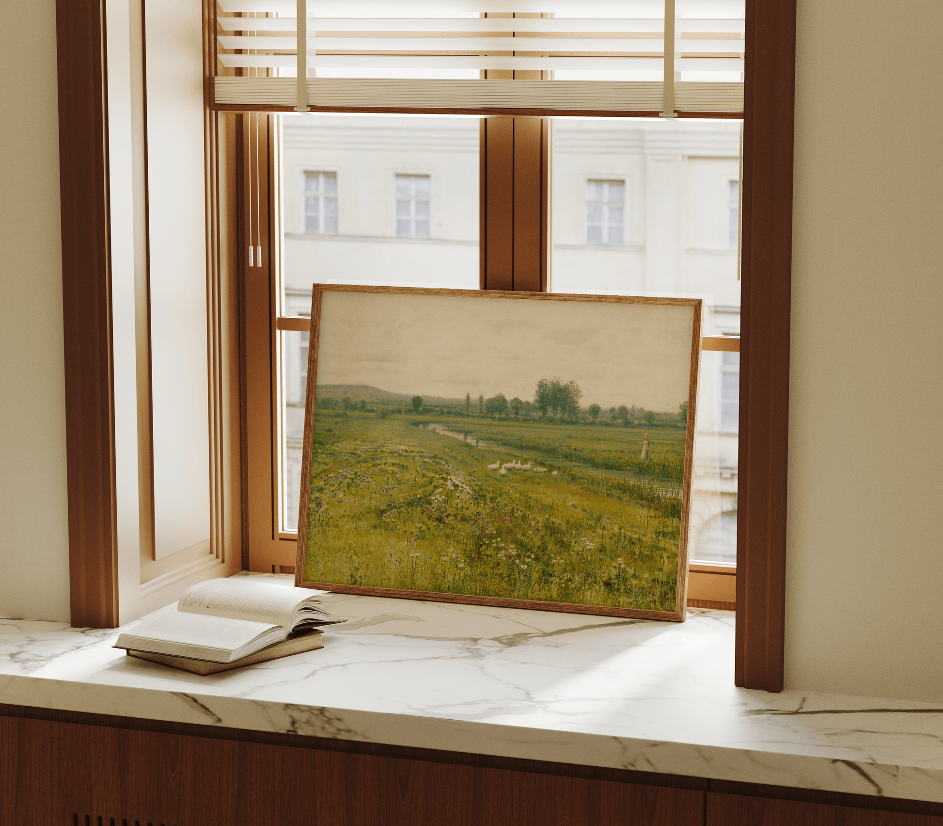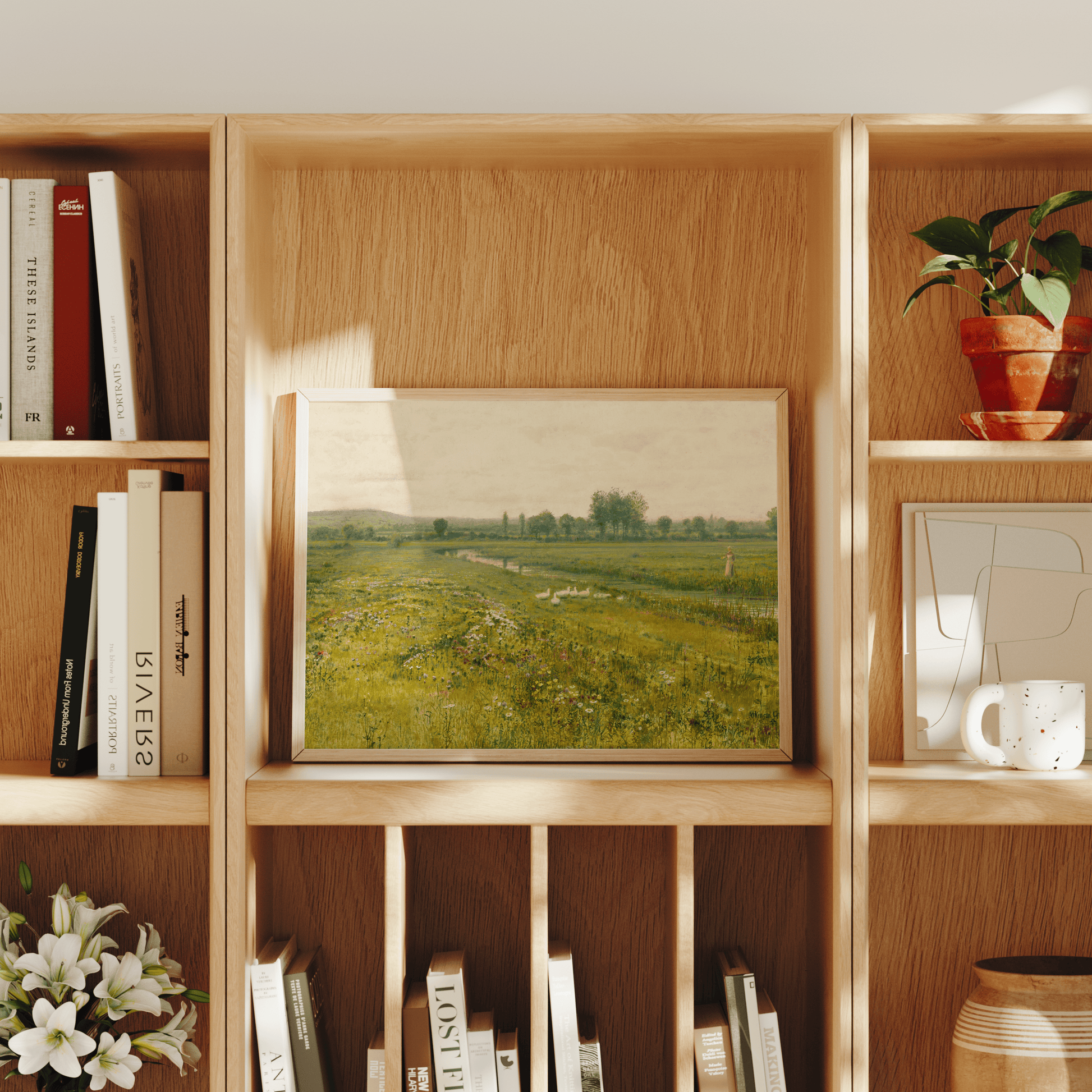 Aporta un toque de serenidad y elegancia clásica a tu hogar con esta lámina de "An Extensive Meadow Landscape with Geese", pintada por John Atkinson Grimshaw, uno de los grandes maestros victorianos de la luz y la atmósfera.
