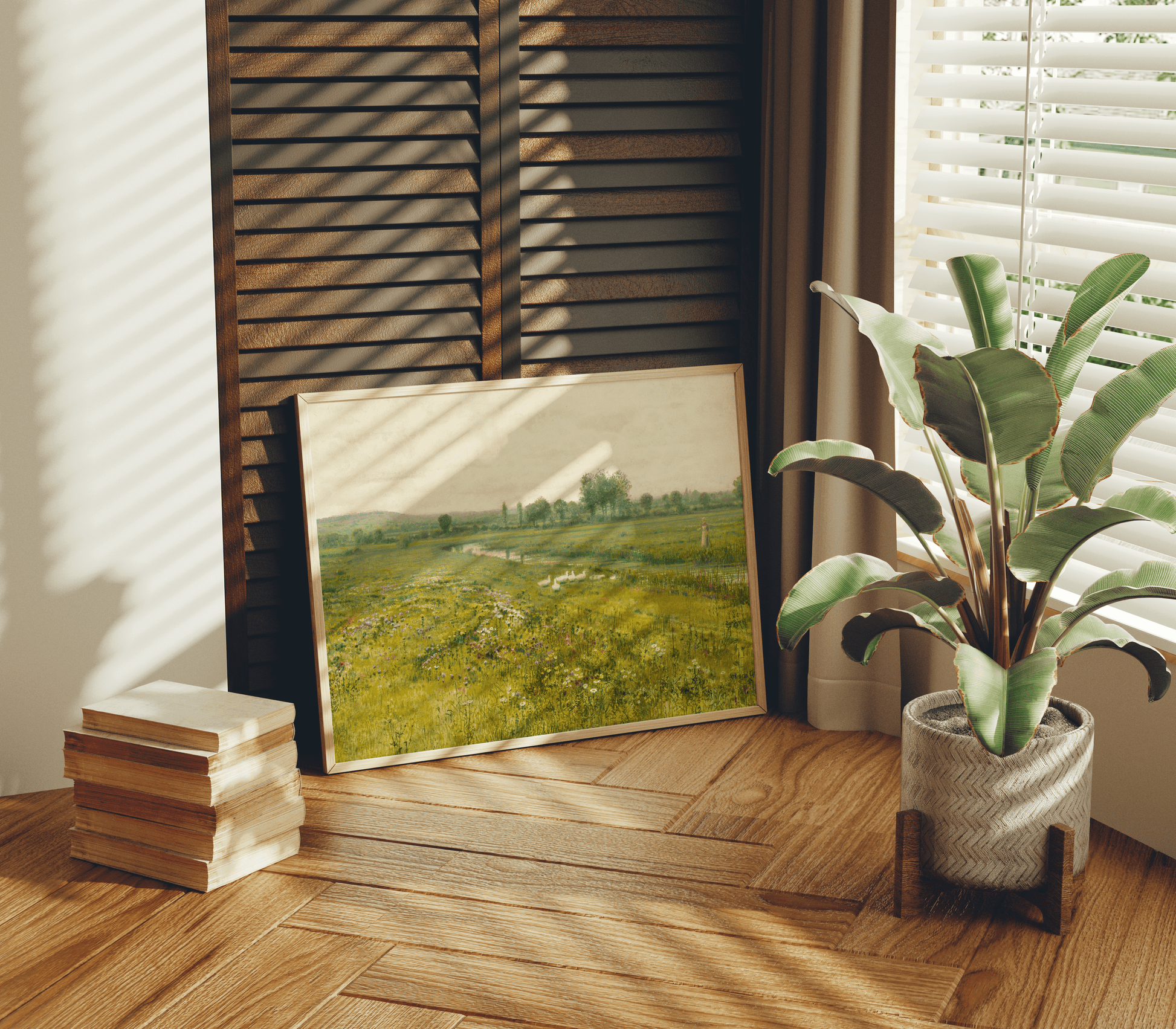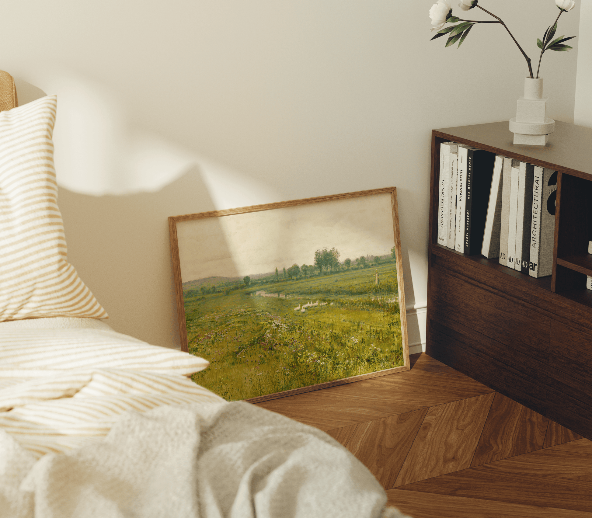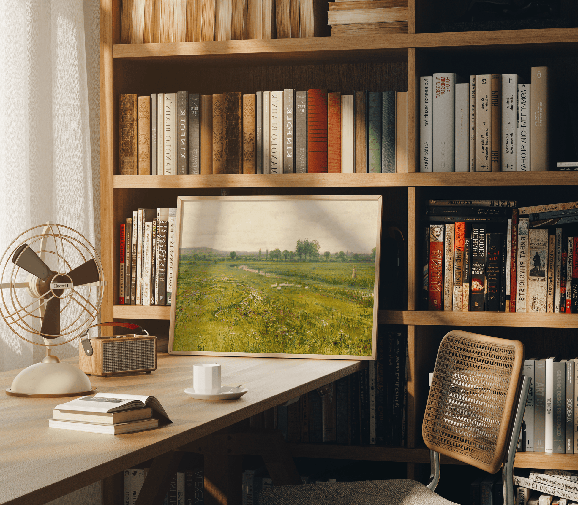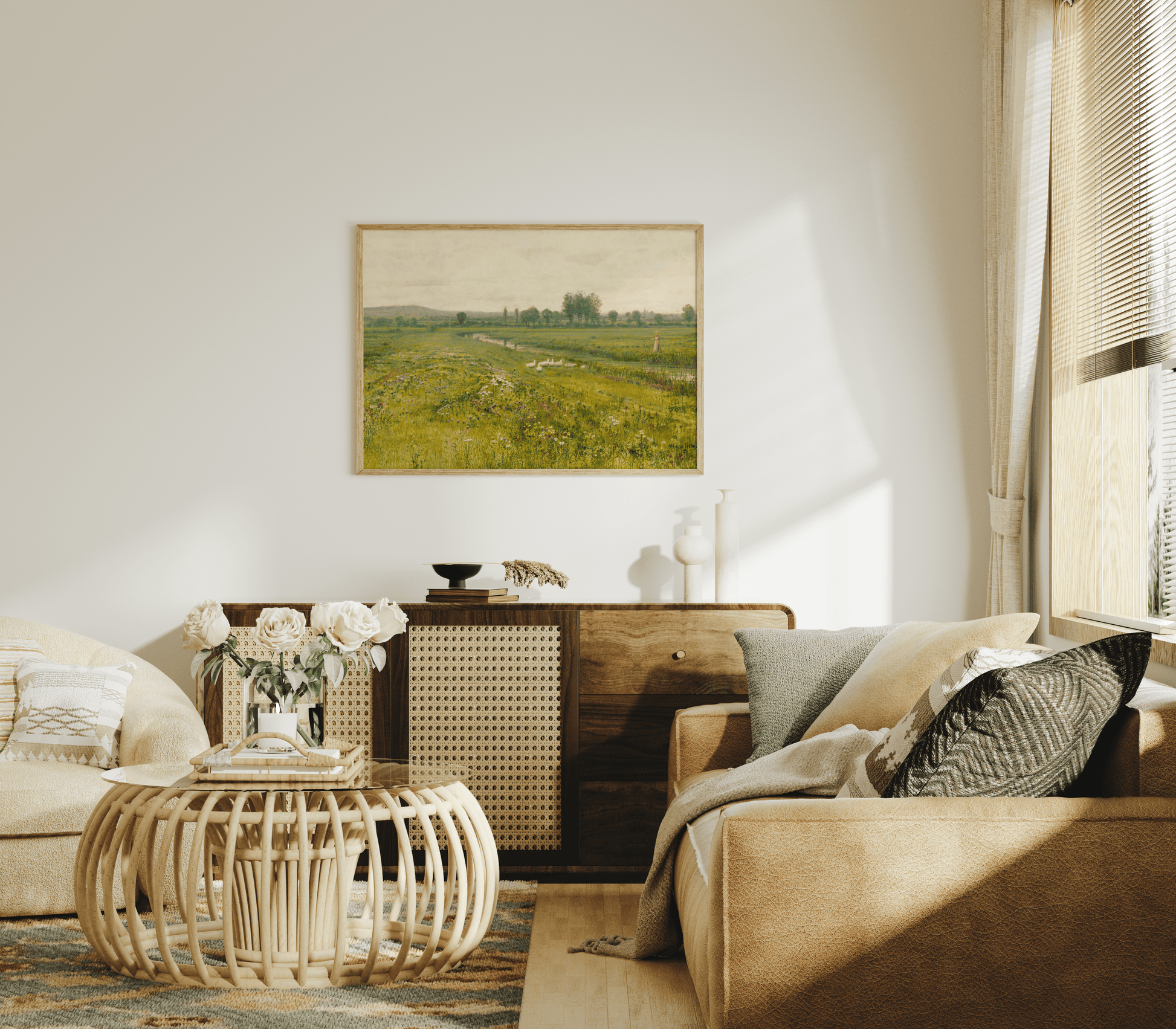 Aporta un toque de serenidad y elegancia clásica a tu hogar con esta lámina de "An Extensive Meadow Landscape with Geese", pintada por John Atkinson Grimshaw, uno de los grandes maestros victorianos de la luz y la atmósfera.